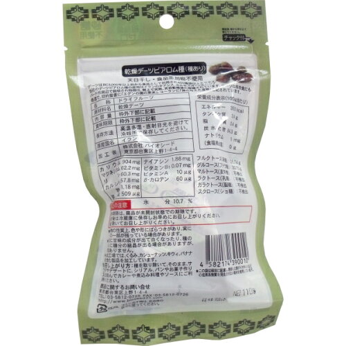 株式会社バイオシード個装サイズ:120X205X20mm個装重量:約120g内容量:110gケースサイズ:29X14.6X27.4cmケース重量:約2.9kg原産国:イラン【発売元:バイオシード】【名称】ドライフルーツ【原材料】乾燥デーツ【保存方法】直射日光・高温多湿を避けて冷暗所で保存してください。